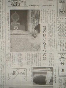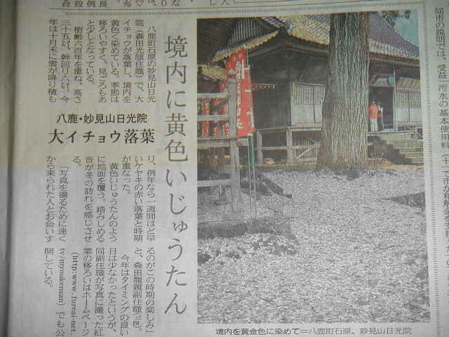 2002年11月26日 / 最終更新日 : 2020年3月16日 peanuts トピックス 金のじゅうたん 平成14年11月26日 神戸新聞に日光院の大銀杏が掲載されました。毎年この時期に新聞の片隅を彩る黄色いじゅうたんを今年も見る事が出来ました事は本当に有難いことでした。