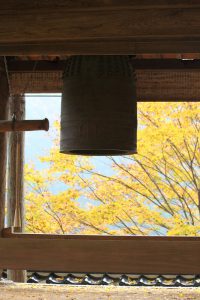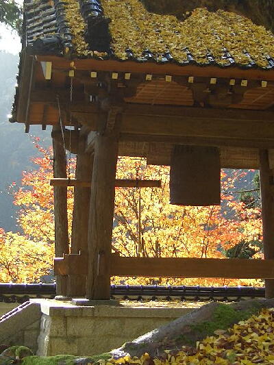 朝日を浴びたもみじが鐘撞堂の向こうで輝いていました。